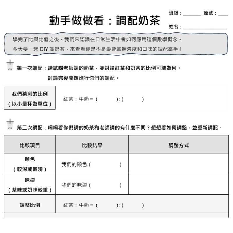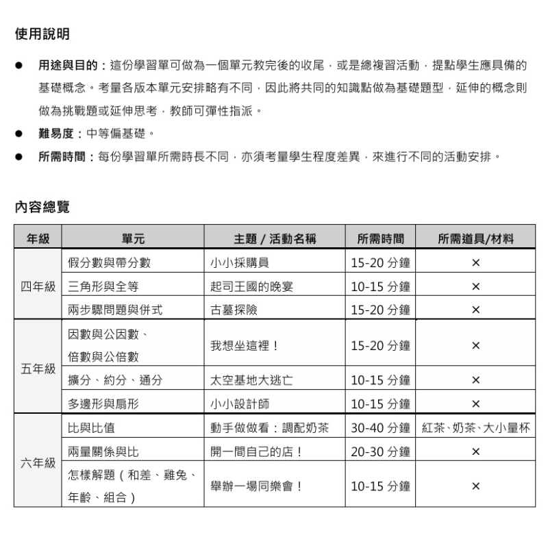 • 所需時間:每份學習單所需時長不同,亦須考量學生程度差異,來進行不同的活動安排。