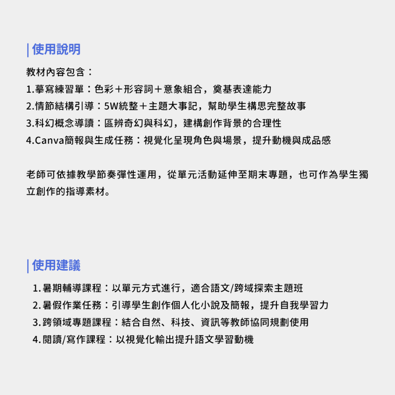 教師可依據教學節奏彈性運用,從單元活動延伸至期末專題,也可作為學生獨立創作的指導素材。