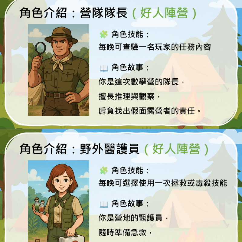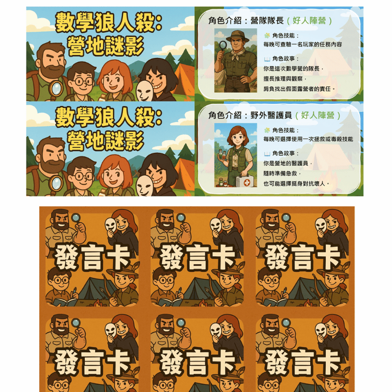 - 角色卡:需裁切及黏貼,放在身份卡包中。學生隨機抽取,確認完就放回