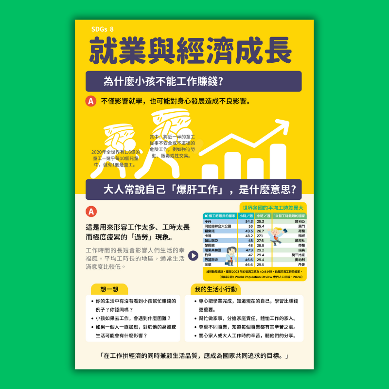 本海報概念設計靈感,取材自:《SDGs100問:最強圖解X超酷行動 破解一百個影響未來的永續議題》,老師可將本書與本海報搭配使用,作為課堂討論引導、專題研究啟發、行動方案設計的補充教材,進一步幫助學生在「思考」與「實踐」之間建立連結。