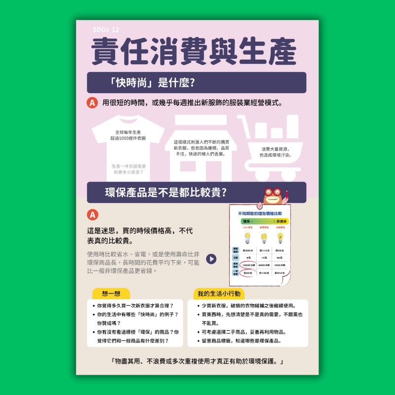 - 例如在「責任消費與生產」主題,學生可觀察自己的購物習慣,討論「快時尚」對環境的影響。