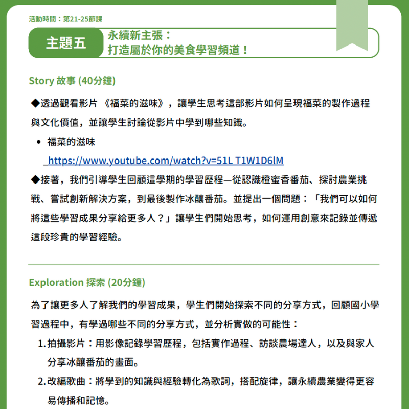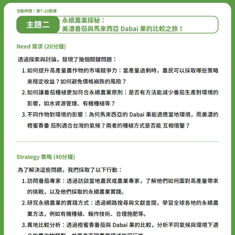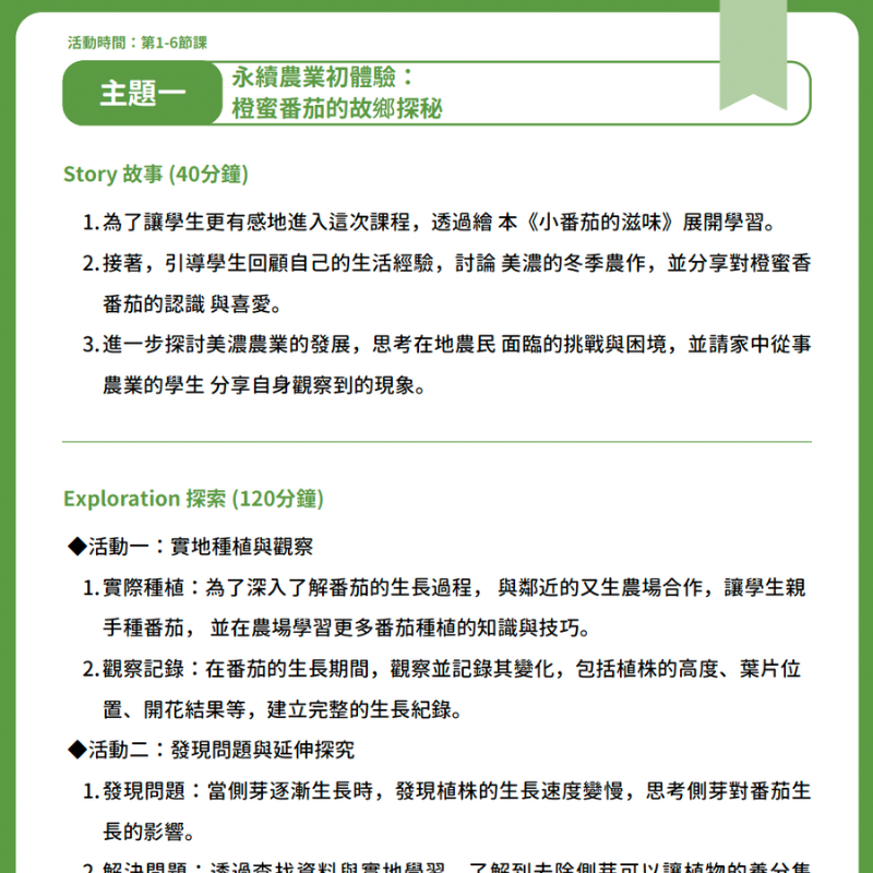本教案運用「Story 故事 、Exploration 探索、 Need 需求、 Strategy 策略 、Echo迴響」五大模組,引導學生認識美濃番茄的種植與永續農業。課程強調實踐與探究,讓學生在體驗中培養科學素養、環境意識與創新能力,並為未來的永續發展奠定基礎。課程設計五個主題: