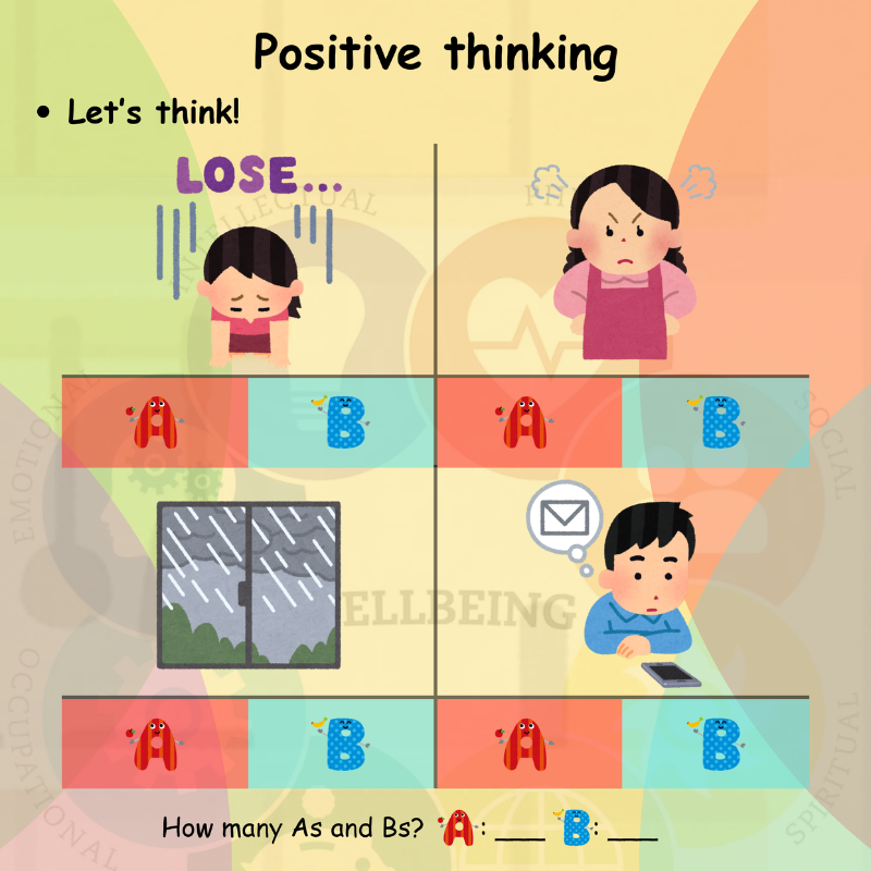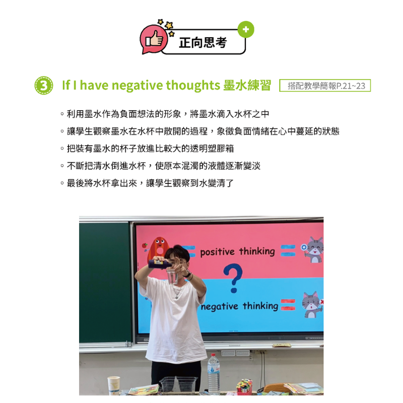 - 提供負面想法與正向想法的對照句,鼓勵學生「換句話說」。