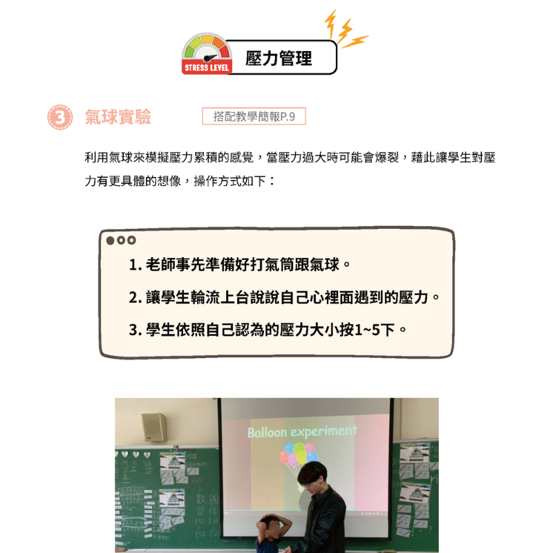- 氣球實驗:用打氣筒和氣球模擬壓力累積的過程,幫助學生理解壓力的危險與轉折點。