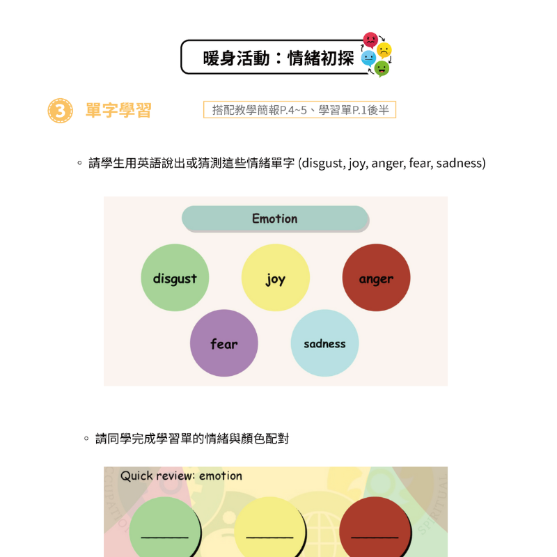 - 引導學生用英文說出常見情緒詞彙(sadness, joy, anger, fear, disgust)。