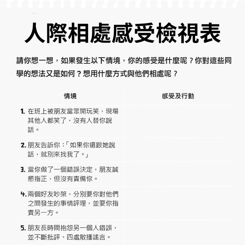 - 人際相處感受檢視表 —— 反思自己在人際互動中的感受與模式。
