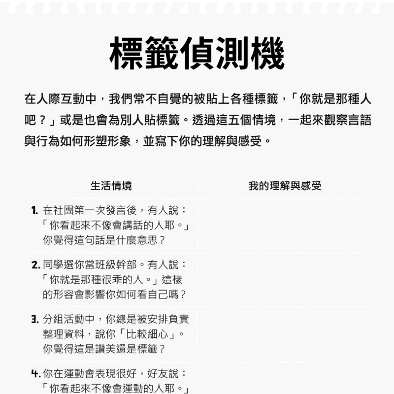 - 標籤偵測機 —— 認識並拆解「標籤化」帶來的影響。
