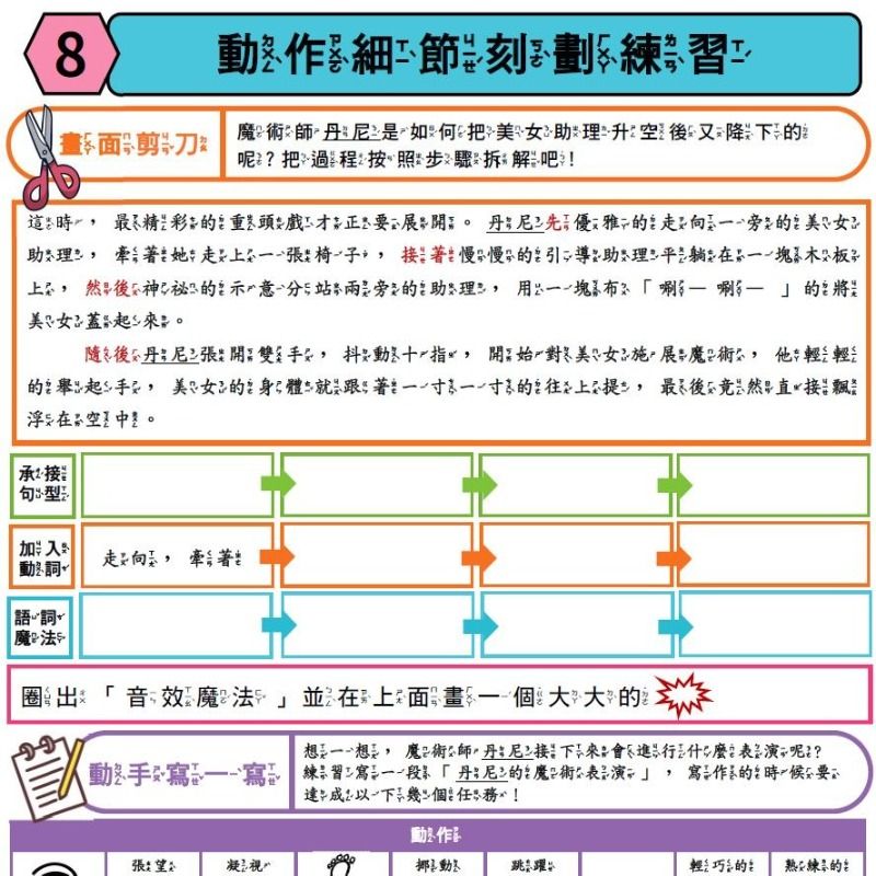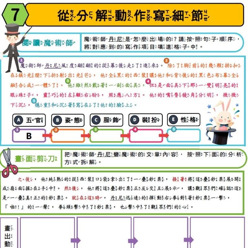 課程說明|學習單設計採用「有點難,又不會太難」的學習原則,設計出兩份學習單,並且附上給老師的教學手冊,讓學生循序漸進的學習,從閱讀文章開始,分辨出人物的動作、五官、姿態等,並學習寫作中很重要的「承接句型」技巧。最後,則讓學生看過範例後,實際去查找一個魔術影片,撰寫一篇生動的人物寫作短文。